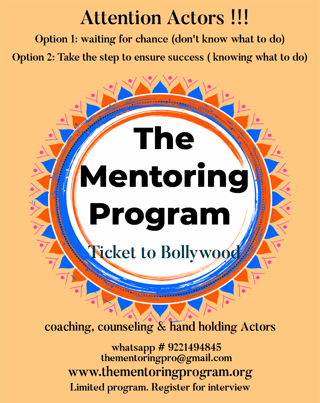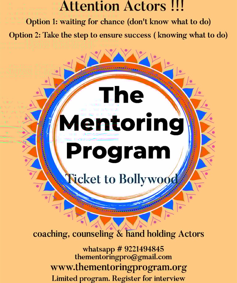 The mission is to help and hand hold budding actors to get a grounding in the film Industry. Most of the actors come to the Bollywood and don't know where to start, what to do, what are the pre-requisites, how to develop skills, how to grow in this fast-paced industry, how to meet genuine people, how to land up right opportunities, how to cope up the stress, how to be in the circle etc. To create a niche for yourself you need to understand what actually it takes to be successful. We at the mentoring program have designed a plan which will give you all the answers, which will take your career in the right direction to achieve the goals. We have created this program with utmost care so that all your needs are addressed and you sail smoothly on the path of success. This unique program is a combination of coaching, counselling and hand holding to give you the best results in much shorter time.